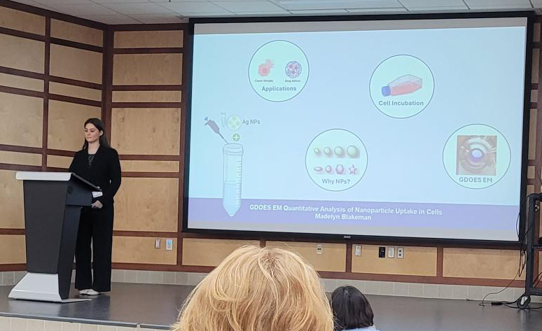 - M. Blakeman, R. Joshi, B. Rodriguez, M. Mckay, D. Pappas, G. Gamez. GDOES EM quantitative analysis of nanoparticle interactions with biological systems, TTU Undergraduate Research Conference, Lubbock, USA, April 1-2, 2025.